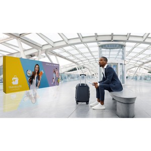 This pop-up display transforms from a compact unit to an impressive backdrop in minutes. Your artwork will be dye sublimated on polyester knit fabric. Graphic panel covers the front and two sides of the frame; back of the frame is not covered. Hook-and-loop fasteners make graphic installation simple. Aluminum frame with nylon plastic hubs. Carry case included. Two-year warranty on hardware.