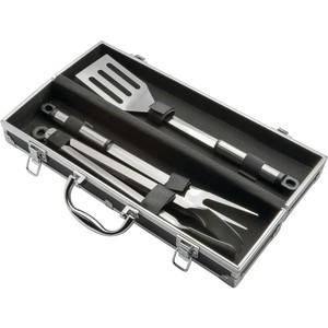 3 piece BBQ set that has everything you need to get grilling! Stainless steel spatula, fork, and tongs all packaged in an aluminum-trimmed carrying case.