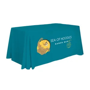 Our most popular table throw is elegant in its simplicity. For use with tables 4' wide. Covers four sides of the table. Draped corners. Constructed of polyester poplin. Flame retardant treated (FR rated for exhibit halls). Machine-washable and wrinkle-resistant; do not dry clean or iron.