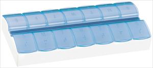 This pill box features large compartments and an easy-scoop design. It has a white base for a vivid decoration and comes with a choice of lid colors.