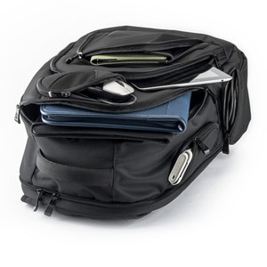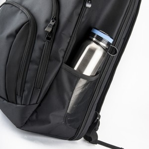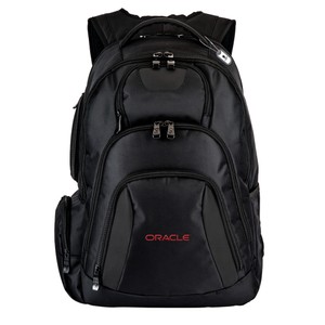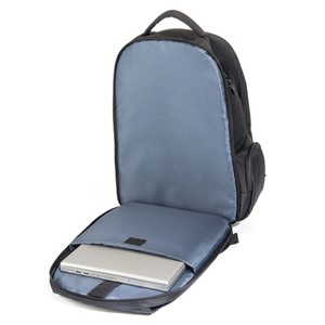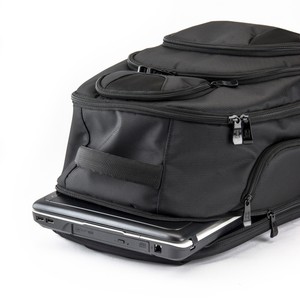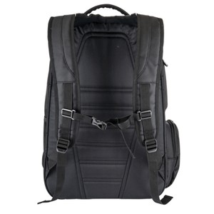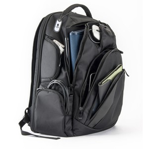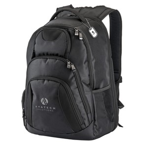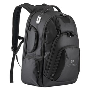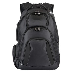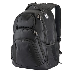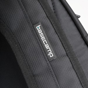 Sturdy 1680D cross weave material with black PVC leatherette matte accents and 210D lining backpack. Includes front pockets (one fleece lined), center organizer pockets, mesh side pockets, zippered accessory pockets, and dual-zipper padded TSA friendly laptop pocket. Padded top handle and adjustable shoulder and sternum straps; fits up to most 17" laptops. Includes decorative Basecamp dog tag.