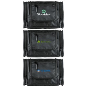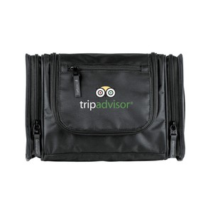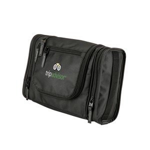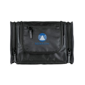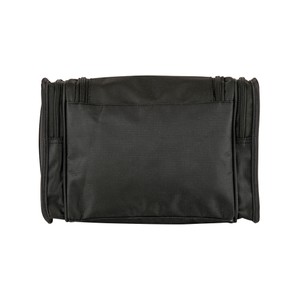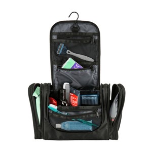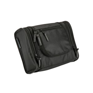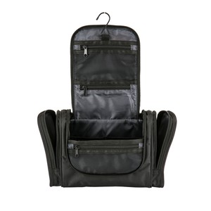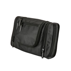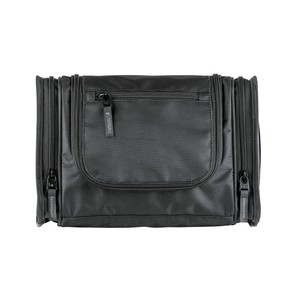 1680D/PVC cross weave outer with 210D lining travel kit hanging hook. Main compartment with interior organization; front zip pocket; side grab handle.
