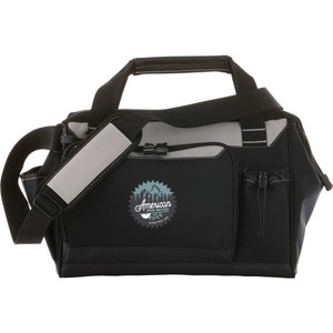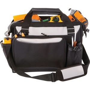 The Workmate 14" molded base tool bag is perfect for any tool enthusiast. Made out of 600D poly with a molded base this bag will stand up to the weight of all tools. It features 1 exterior side pocket, 1 front zipped pocket and a convenient water bottle front pocket. The metal wire frame provides easy access to the interior webbing loops that provide tool organization. This sturdy bag also has reinforced handle grips to provide durability while carrying. Includes padded carrying strap.