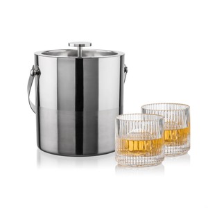 The Catania Ice Bucket with On-the-Rocks Set brings refined style and practicality to any bar or entertaining space. Crafted from durable stainless steel, the ice bucket features double-walled insulation for longer-lasting chill, a modern two-tone finish with a shiny polished upper half, a brushed lower half, and a single carrying handle strap, paired with a secure-fitting lid. The set is completed with two classic on-the-rocks glasses, making it an elegant and ready-to-serve solution for cocktails, spirits, and hospitality settings.