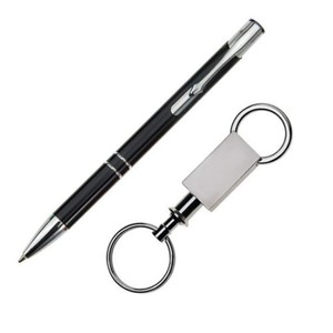 Gift set with P197 Clicker aluminum click-action ballpoint pen and KC110 keyring.