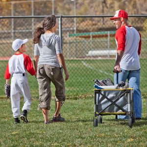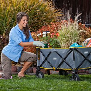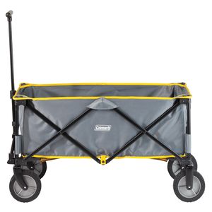 Coleman® Camp Wagon has a telescoping handle, swivel wheels, 5 cubic feet space, an accordion folding design with a carry bag, and supports up to 150 lbs.