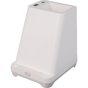 The desk mate includes all of your desktop essentials: Bluetooth Speaker, Stand, Charging Hub, and pen holder. The bluetooth speaker will provide over three hours of playback time at max volume. The built in microphone allows the the desk mate to be used for conference calls without holding your phone. The USB C and USB A charging hub allow you to charge your devices at your desk.