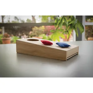 Bored at home or at work? Bring the fun to your desk with this wooden Desktop Bean Bag Game, a compact version of the classic cornhole game. Perfect for quick, friendly competition, it comes with eight bean bags — four blue and four red — so you can start playing right away. It features a bottom lid that slides out for easy access to everything inside. With a large imprint area, it’s also a great way to showcase your brand while adding some fun to any workspace! This product is not intended for use by children or pets. It may present a choking hazard to children under 3 years of age.