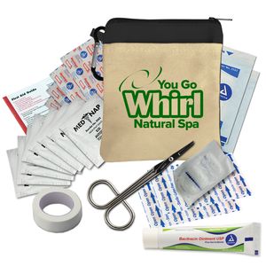 Keep safety close at hand with this compact 100% cotton canvas pouch designed as a portable first aid kit. Featuring a colorful accent band, zippered closure, and attached carabiner, it clips easily to bags or backpacks for quick access. Inside, you’ll find a well-stocked assortment of essentials for treating minor cuts and scrapes, including adhesive bandages, antiseptic towelettes, first aid cream, gauze pads, and scissors. It’s the perfect companion for home, travel, or outdoor adventures.