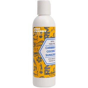 Earth-friendly promo for fun in the sun activities. Our reef-friendly coconut-scented sunscreen has the best natural sunscreen ingredients to protect your skin and the ocean. No nasty ingredients like oxybenzone or parabens! Enjoy a smooth application with hydrating properties that are gentle on the skin with SPF 20 coverage. Product is mineral based.