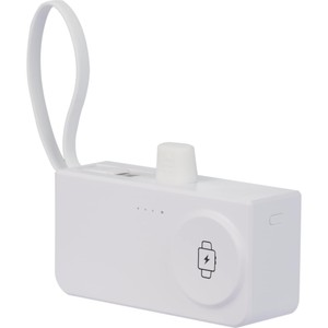 The Hue 5000 Power Bank with iWatch Charger features a 5,000 mAh/18Wh rechargeable lithium polymer battery, an integrated 5.5-inch cable with Type-C Input/Output tip as a lanyard and 2-in-1 dual compatible fixed tip for Apple® iOS devices and Android devices with Micro input. Type-C Input/Output Tip: 5V/2A (10W); Type-C Input/Output Port: 5V/2A (10W); 2-in-1 Output Tip: 5V/2A (10W). It also supports wireless charging at up to 2W for Apple Watch 1 to 10. The power bank itself can be recharged through integrated cable with Type-C tip or your own Type-C cable. Power banks are permitted in carry-on luggage only, and at the discretion of TSA agents. Please charge the power bank before initial use.
