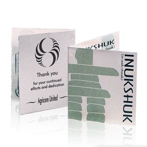 The Inukshuk on Chipped Pen Set features a black pen with silver-finish trim and holder, flanked by a frosted Mini Inukshuk figure, on a chipped 3/8” jade glass base. A similar item with gold-finish trim and holder is also available. The iconic Inukshuk, emblematic of the traditional nomadic Inuit of the eastern arctic, is symbolic of cooperation and interdependence.