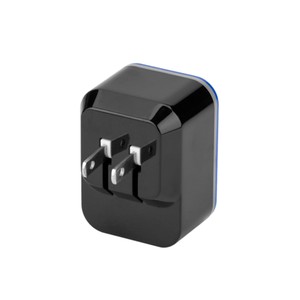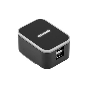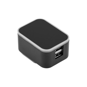 Two port USB wall adapter with foldable prongs. Imprint lights up when plugged in. 2A total output; UL Listed.