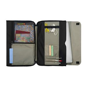 Interior features a multi-function organizer with various storage pockets ideal for storing pens, cords, flash drives, a smartphone and more!