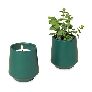 A 6oz soy-blend scented candle is outfitted in a matte glazed ceramic vessel and includes an organic seed packet to grow plant once the candle has been burned down
