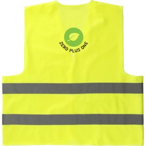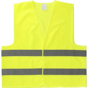 The Safety Vest is a neon yellow safety vest with reflective stripes. One size fits most up to XL. Hook and loop closure on the front.