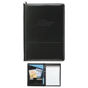 This zippered vinyl padfolio provides a sizable secure space for notes and cards. It includes a writing pad and features a vinyl pen loop and two small and two large interior pockets.