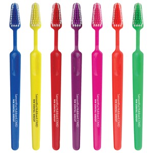 The Signature Soft Toothbrush is a high-quality, adult-sized toothbrush with soft bristles, plus matching inner bristles and body colors. It's also made in the USA. Optional matching toothbrush travel caps available at $0.20(G) each and are packed separately. This product meets FDA requirements and is only available for shipment within the United States (including Alaska, Hawaii & Puerto Rico). Less than minimum orders are not available. FOB ZIP: WI, 54703.