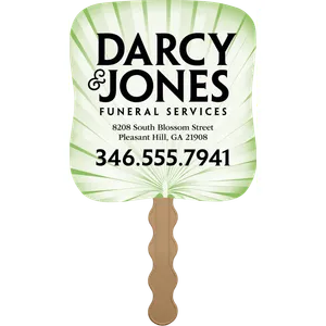 These paper fans feature a green palm leaf pattern with a subtle sunburst effect, offering a sophisticated touch to the design. Your custom imprint in black ink stands out clearly, making these fans both practical and stylish for events, churches, memorial services, and more. The FSC® label means that the materials used for this product come from well-managed FSC®-certified forests and other controlled sources.
