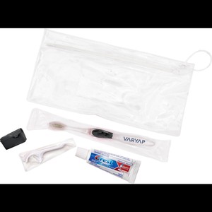 The Teen Wellness 5-Piece Kit is packed in a clear, resealable zipper pouch with a business card pocket on the back. Each kit contains: 1 Teen Accent toothbrush with clear handle & color accents, dental floss sticks, a matching toothbrush travel cap, and 1 tube of Crest® travel toothpaste. An optional 1-color imprint decoration is also available on the pouch. This toothbrush is made in the USA and meets FDA requirements. Only available for shipment within the United States and Canada (including Alaska, Hawaii & Puerto Rico. Less Than Minimum orders are not available. FOB ZIP: WI, 54703.