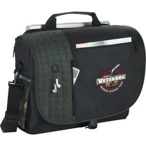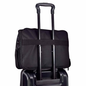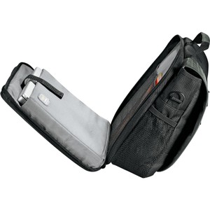 Laptop-only section unfolds lying flat on X-ray belt, expediting airport security. Holds most 15" laptops. Main open compartment with organization under flap. Front zippered main compartment. Second front zippered accessory pocket with access to earbud port. Side mesh pockets. Comfort carry handle and removable, adjustable shoulder strap. Rear trolley handle pass-through.